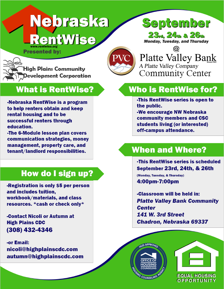High Plains CDC’s RentWise is scheduled at Platte Valley Bank Community Center on September 23rd, 24th, and 26th (Monday, Tuesday, AND Thursday). The roughly 2 module per day (6 modules total) sessions start at 4:00pm. Registration costs is $5. For more information, contact High Plains CDC at (308) 432-4346. This RentWise series is being provided by High Plains CDC and Platte Valley Bank Community Center and is open to the general public.